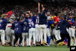 Los jugadores de Venezuela celebran la victoria del equipo por 3-0 sobre República Dominicana en el juego de campeonato de la Serie del Caribe de béisbol, el 9 de febrero de 2024, en Miami. (Foto AP/Wilfredo Lee)